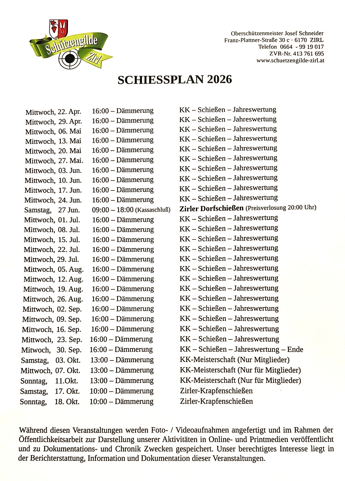 Schießplan 2026